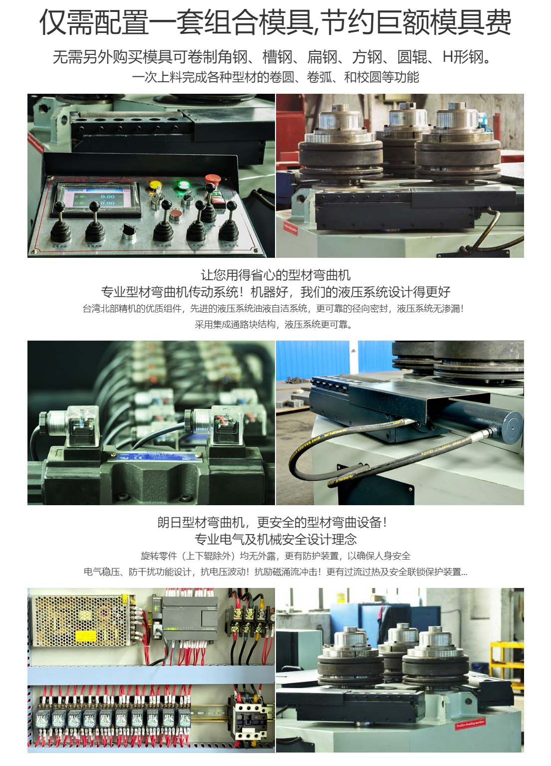 公司主要產(chǎn)品有:大、中、小型,型材彎曲機(jī)、 型材卷圓機(jī)、 法蘭成型機(jī)等型材彎曲設(shè)備。我們的優(yōu)勢:僅需配置一套組合模具,節(jié)約巨額模具費無需另外購買模具可卷制角鋼、槽鋼、扁鋼、方鋼、圓輥、H形鋼。一次上料完成各種型材的卷圓、卷弧、和校圓等功能。支持非標(biāo)定制。